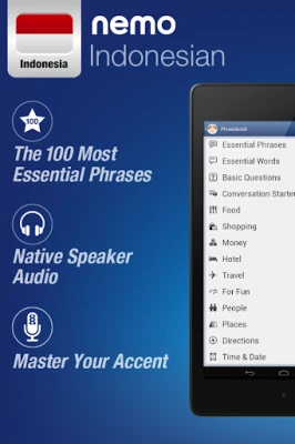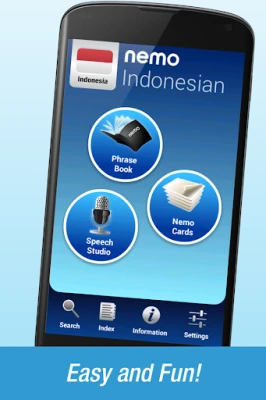 Nemo is designed to start you speaking the most useful words in Indonesian immediately and confidently. With millions of downloads from around the world, Nemo is now available for Android phones and tablets.